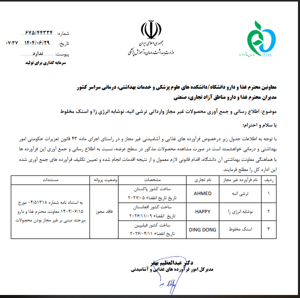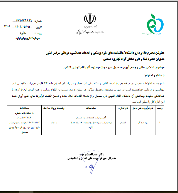 اطلاع رسانی و جمع آوری محصول غیر مجاز مزه زردآلو با نام تجاری ائلشن | 1404.05.05 | مشاهده | |