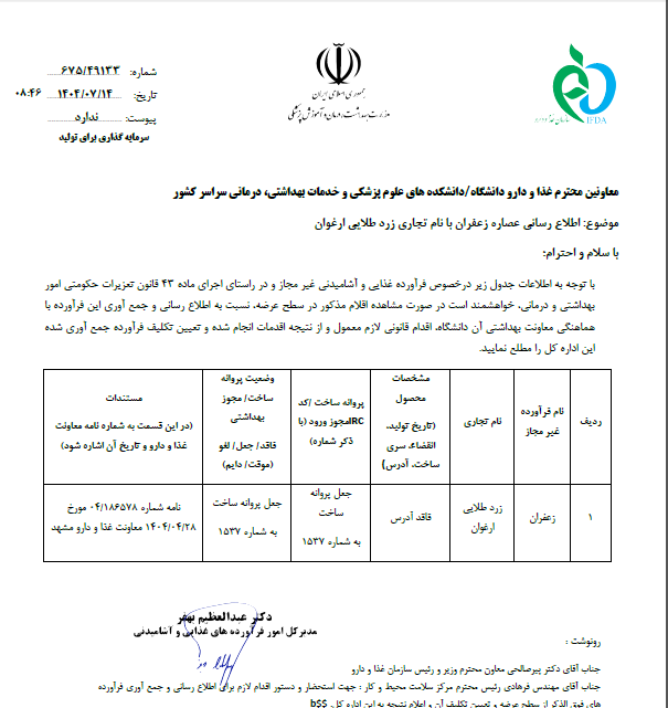 اطلاع رسانی و جمع آوری عصاره زعفران با نان تجاری زرد طلایی ارغوان | 1404/07/14 | مشاهده | |