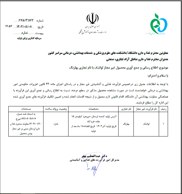 اطلاع رسانی و جمع آوری محصول غیر مجاز لواشک با نام تجاری بهارنگ | 1404.05.08 | مشاهده | |