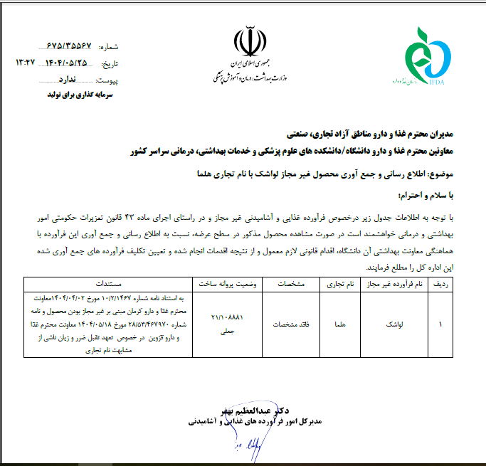 اطلاع رسانی و جمع آوری محصول غیر مجاز لواشک با نام تجاری هلما | 1404.05.25 | مشاهده | |