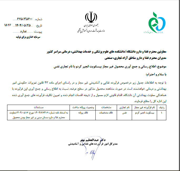 اطلاع رسانی و جمع آوری محصول غیر مجاز بیسکویت انجیر گردو با نام تجاری نفس | 1404.05.25 | مشاهده | |