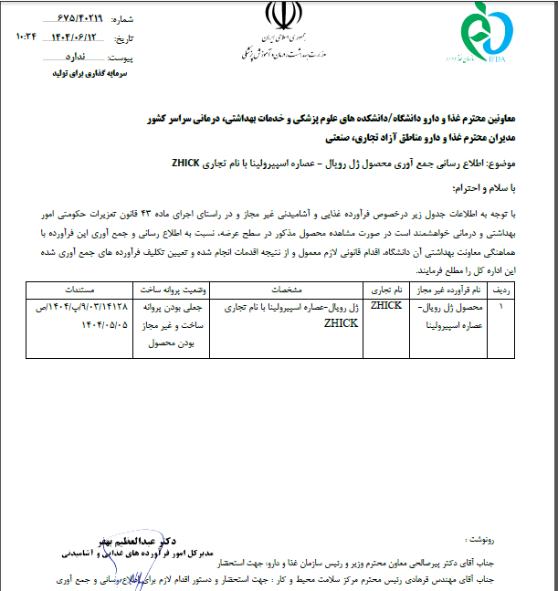 اطلاع رسانی و جمع آوری محصول ژل رویال- عصاره اسپیرولینا با نام تجاری ZHICK | 1404/06/12 | مشاهده | |