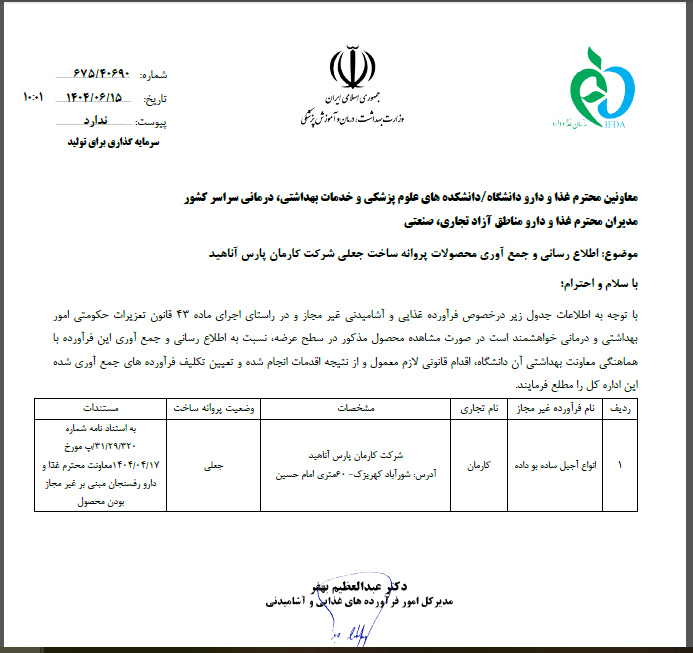 اطلاع رسانی و جمع آوری محصولات پروانه ساخت جعلی شرکت کارمان پارس آناهید | 1404/06/15 | مشاهده | |