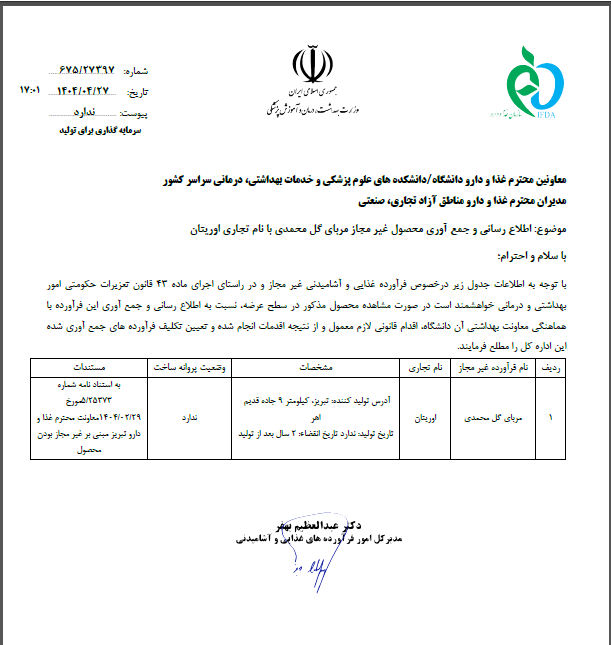 اطلاع رسانی و جمع آوری محصول غیر مجاز مربای گل محمدی با نام تجاری اوریتان | 1404.04.27 | مشاهده | |