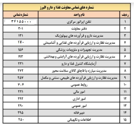 توجه :جهت تماس با واحدهای زیر مجموعه حوزه معاونت غذا و دارو، لطفاً به جای سه صفر آخر شماره تماس اپراتور مرکزی (36155000) شماره داخلی مورد نظر را شماره گیری نمائید.