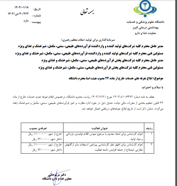 - ابلاغ تعرفه های خدمات خارج از ماده 24 مصوب هیات امنا دانشگاه در حوزه اداره نظارت بر امور فرآورده های طبیعی سنتی و مکمل (1404/01/18)